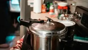A pressure cooker sits on a stove in a man's kitchen; if it breaks and hurts him, he may need a Birmingham product defects attorney.